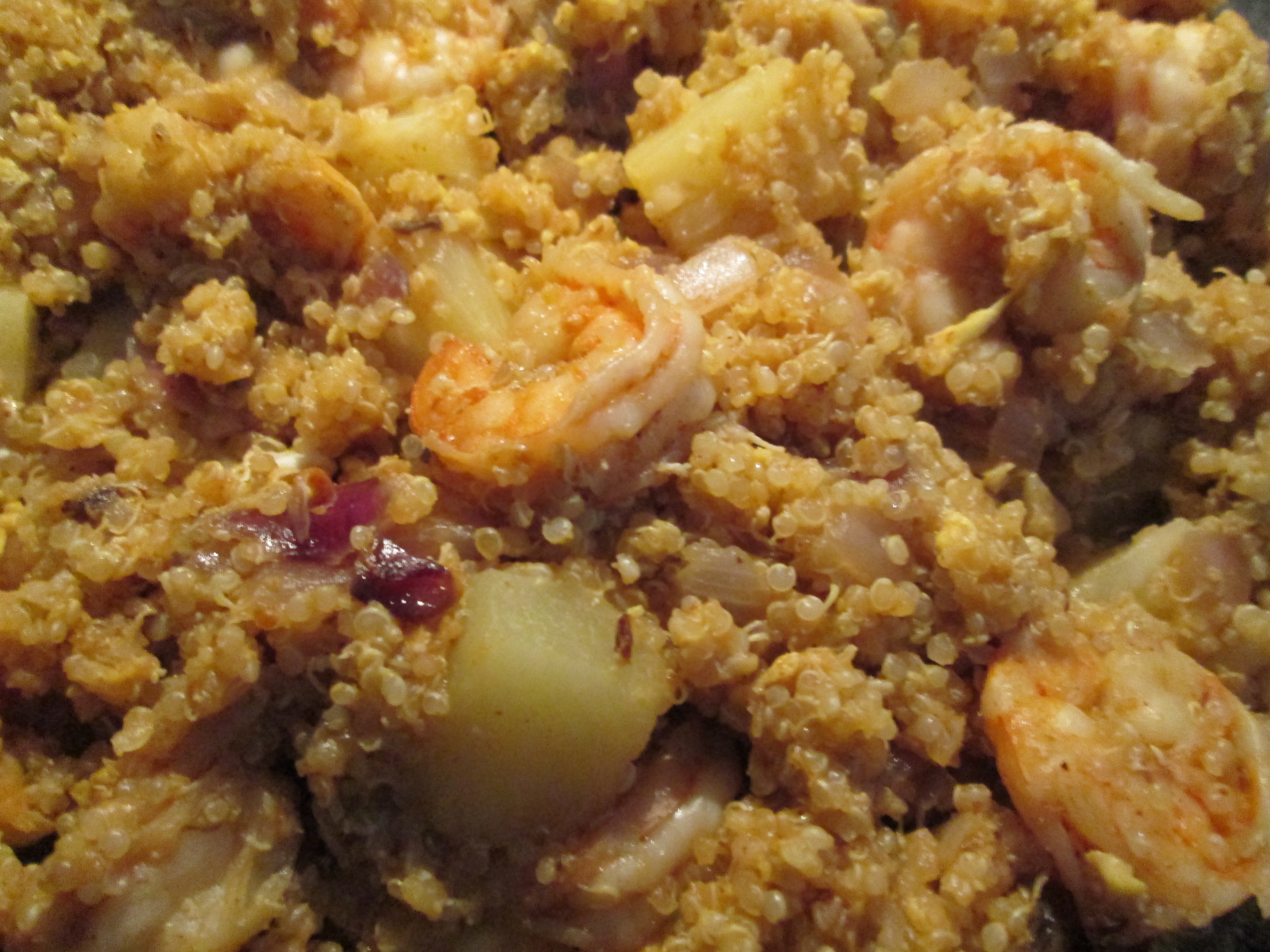 Cook quinoa following instructions on package (I used the rice cooker). It’s usually 2 cups water for every 1 cup. I would say wait until the quinoa is done to move on the next steps. If you buy raw shrimp, make sure you peel and de-vein them! Heat oil on medium heat in large non-stick pan and add the garlic and onions. Cook for about 2 minutes until garlic is a golden brown color, then add the shrimp and chili powder. When the shrimp is fully cooked, add the egg, pineapple, and quinoa. Stir everything together for 3 minutes, adding the soy sauce towards the end.
